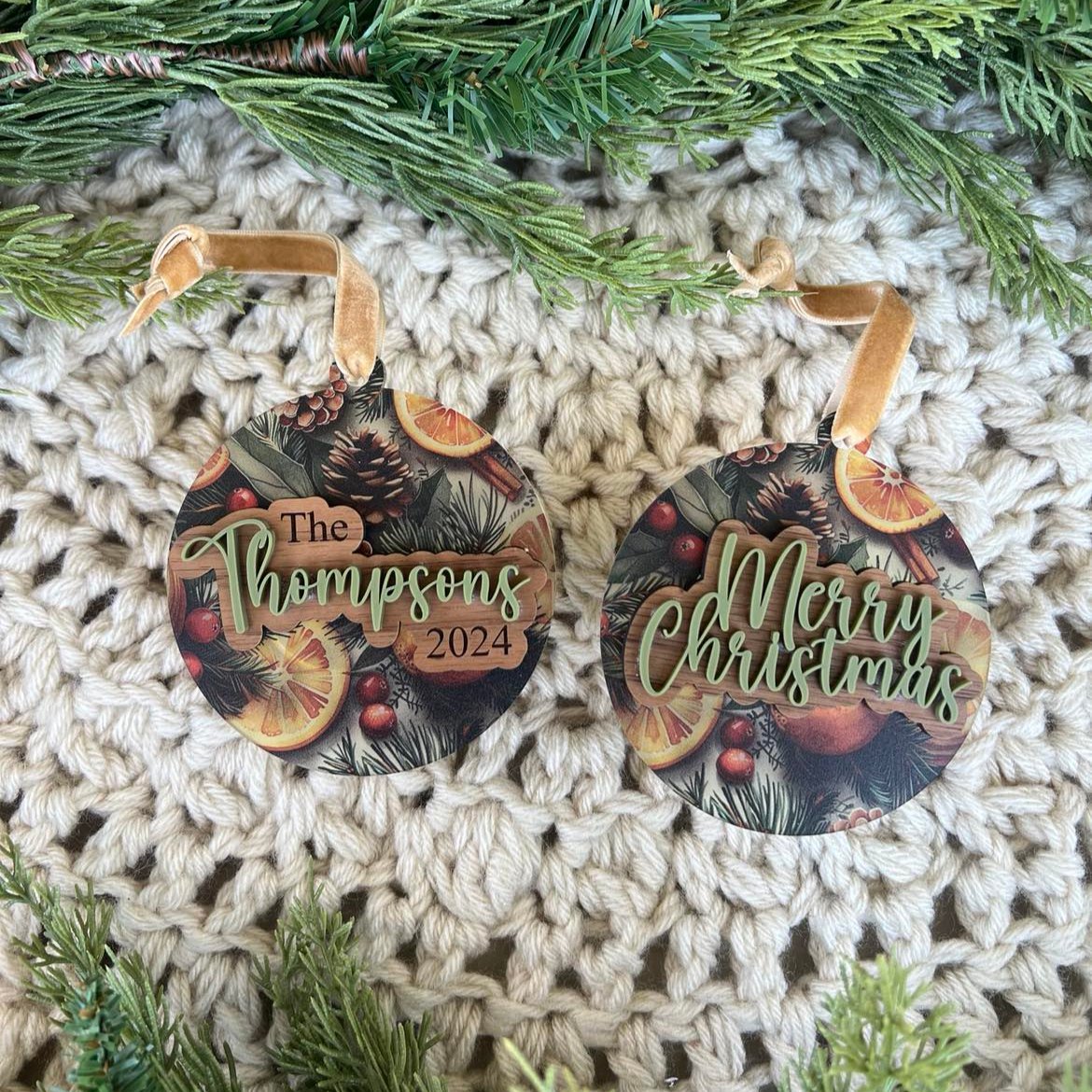 Laser cut/engraved from -1/8" walnut plywood for the name offset.1/8" -sage green acrylic for the name/Merry Christmas -1/8" transparent acrylic with pinecones and oranges design (note-light will shine through the transparent acrylic)