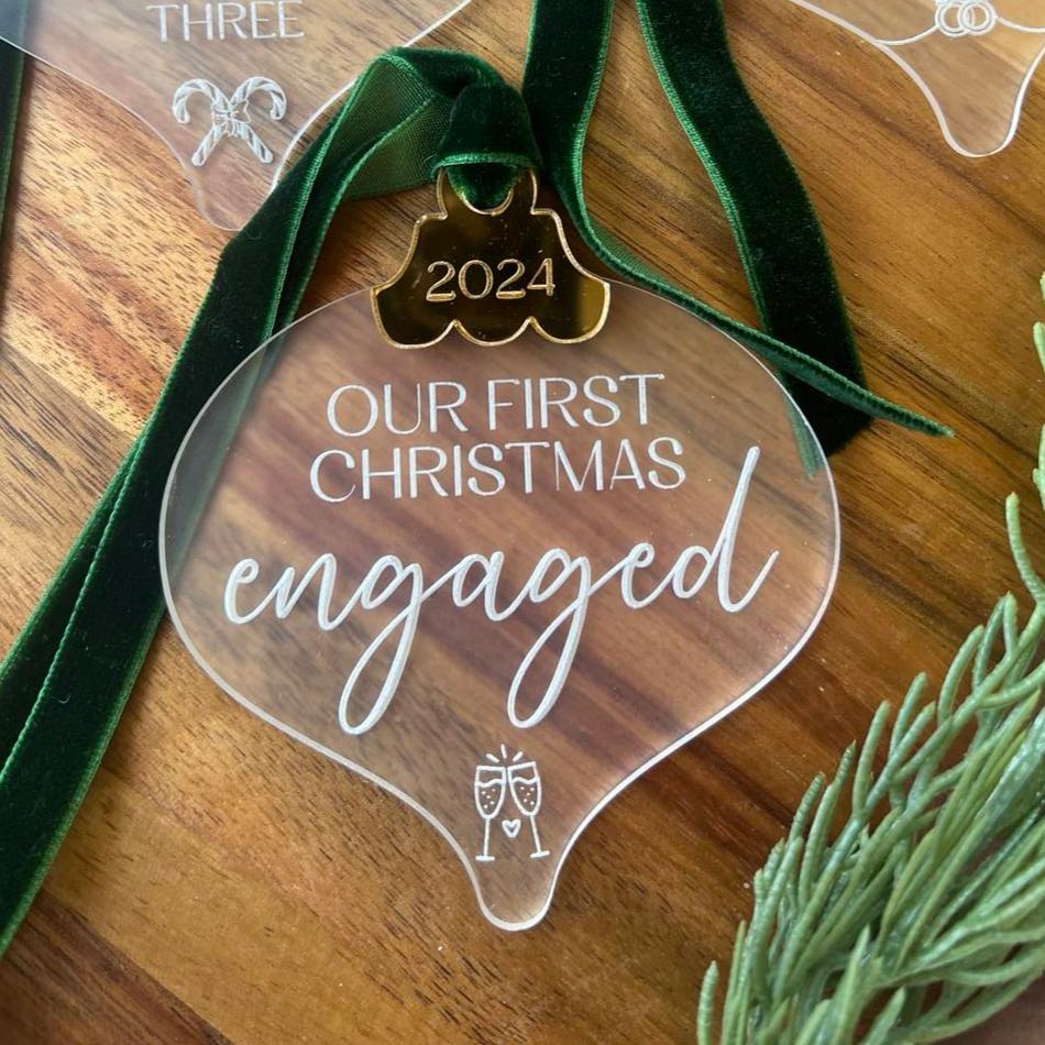 Laser cut and engraved from 1/8" frosted acrylic and mirrored gold acrylic, these ornaments make the perfect keepsake to commemorate a special event.