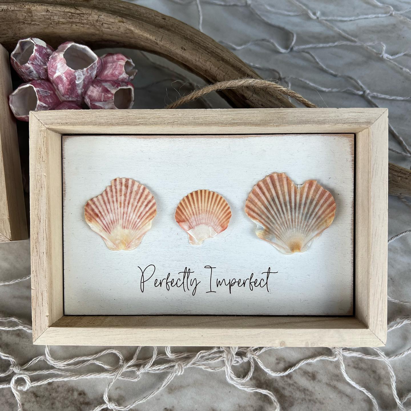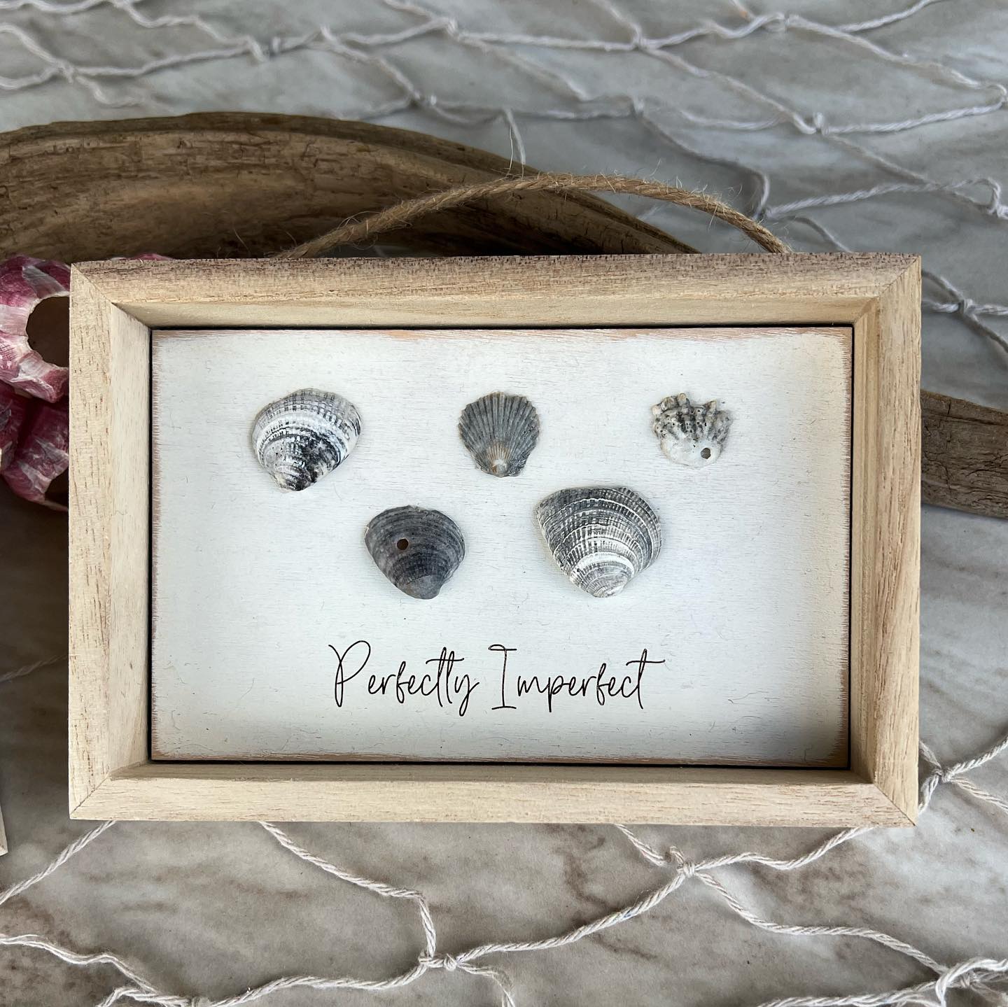 Backer is painted white with slight distressing and the words Perfectly Imperfect engraved into it.