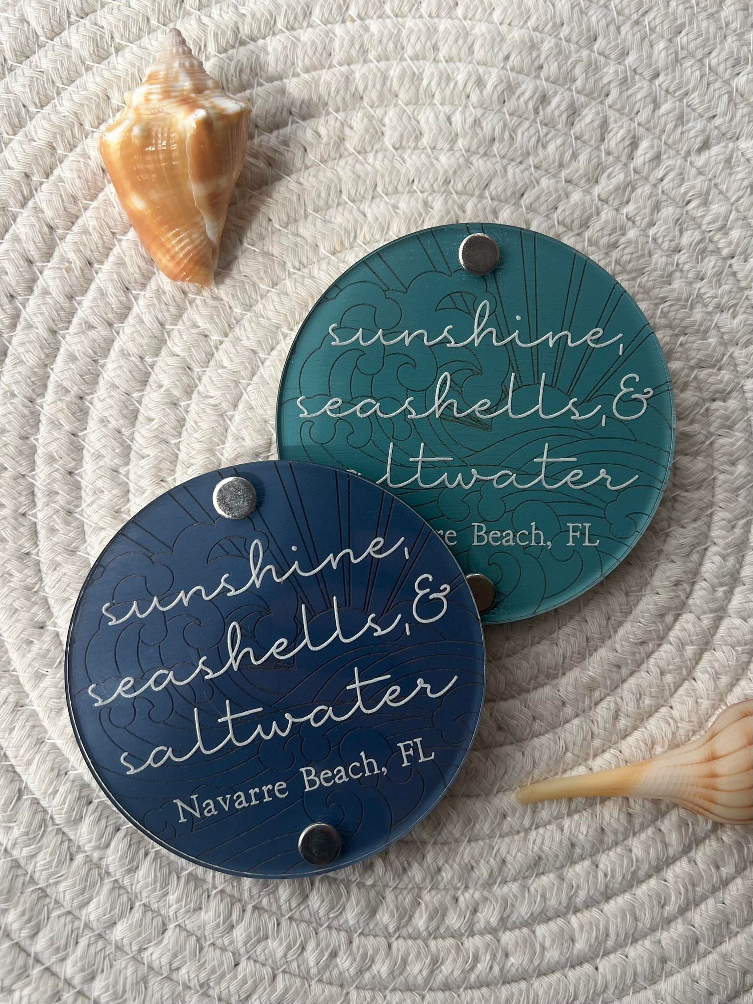 Laser cut/engraved from 1/8" painted birch plywood and 1/8" clear acrylic. Layers adhered with silver accent screws.