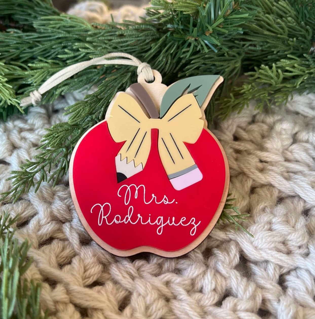 Show your appreciation for educators with a personalized ornament made from birch and acrylic.